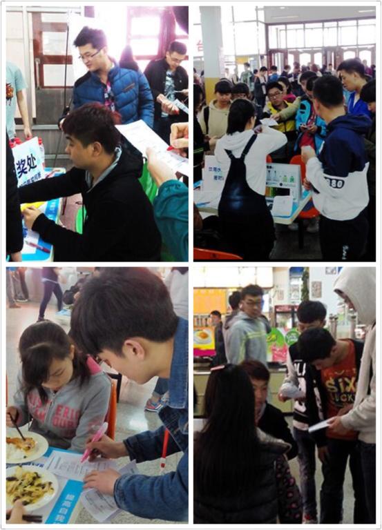 活动利用学生午餐时间,呼吁现场的同学们参加趣味水质测试实验及水知识问答。活动当天分别在食堂两个出口设置工作台,每个工作台分别安置3-4名志愿者进行水质讲解、调研试卷批改、讲解答案及奖品发放。在食堂每一层安排问卷调查员,每层安排12-15名志愿者,进行问卷调查。在工作人员有条不紊的安排和参与人员积极配合下,本次活动顺利展开,参加此次活动志愿者四十五人,共有1520为学生参与此次调查。