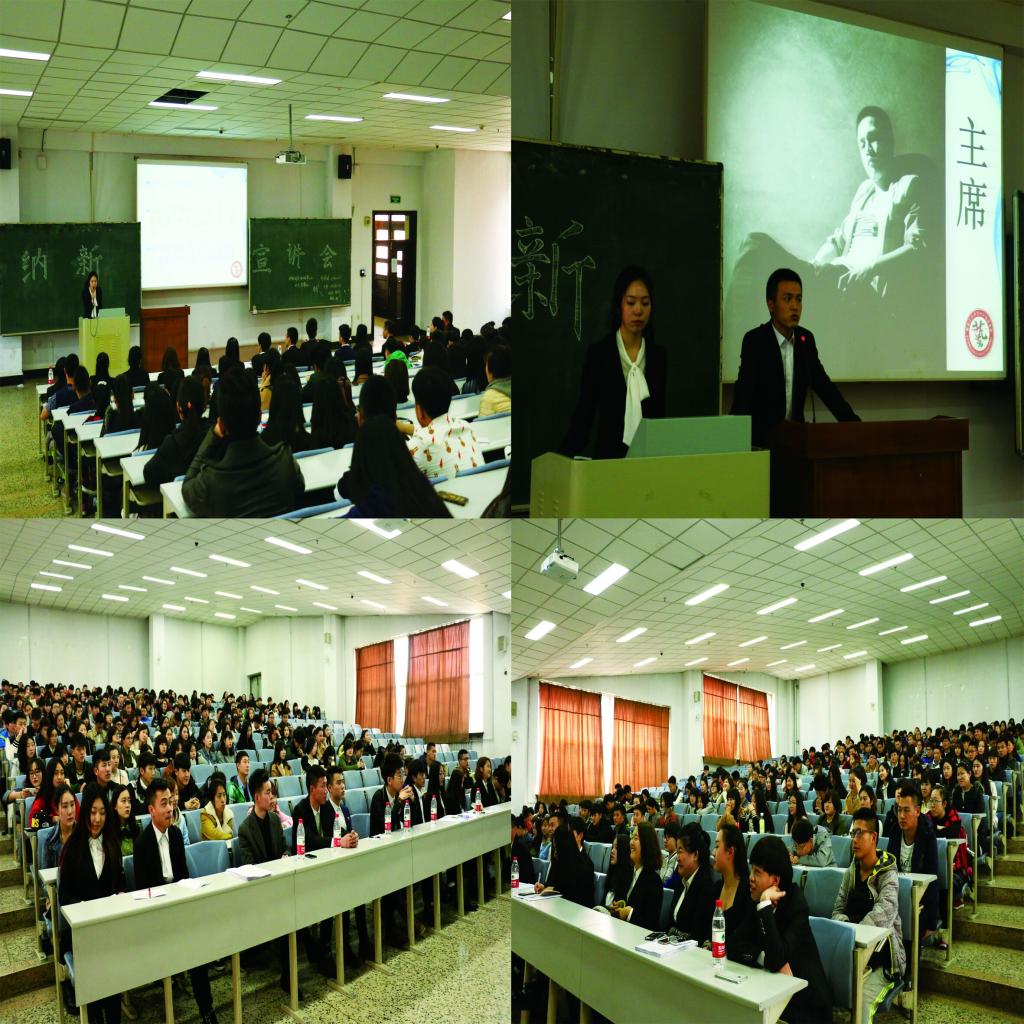 yl9193永利集团学生会与青年志愿者协会纳新宣讲大会于2015年3月25日下午1:30在汇文楼120教室召开。出席本次大会的有2014级辅导员马俊,yl9193永利集团第十三届学生会及青年志愿者协会全体同学。会议由学生会副秘书长王畅同学主持。