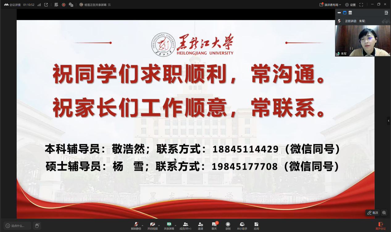 最后,党委副书记朱军老师结合当前就业形势,指出企业用人需求日益多元化,对人才的综合素质、实践能力和创新思维要求不断提升。她鼓励毕业生要顺应趋势,提升核心竞争力,主动适应市场变化,积极参与线上线下招聘活动,灵活把握每一个发展机遇。同时,她呼吁家长主动关注学生的就业动态,与学院保持密切沟通,共同提供科学合理的职业规划支持,凝聚家校合力,打造坚实的就业支持体系,为毕业生的职业发展提供有力保障。