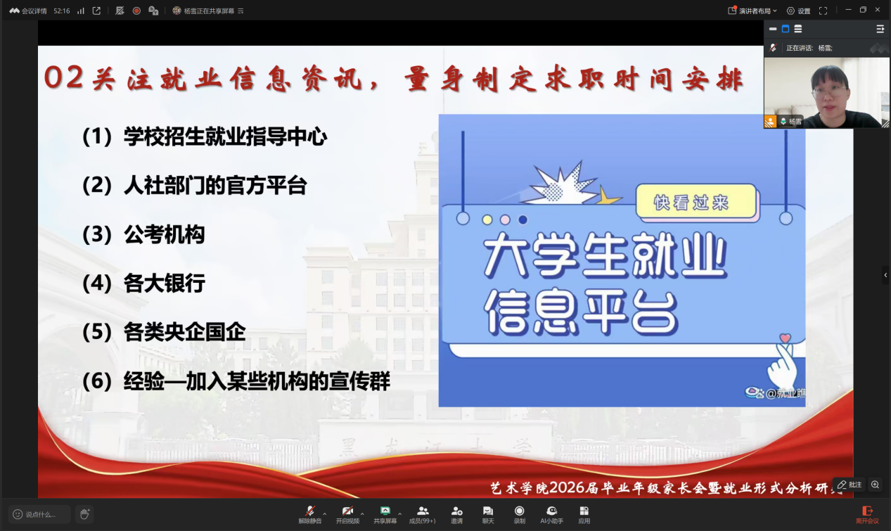 随后,杨雪老师结合学生实际,阐述了毕业前科学规划的重要性。她指出,毕业生首先要做好自我评估,明确个人优势和发展定位;同时应关注就业信息,合理制定时间表,保持积极心态应对竞争和压力。在谈到家校联动时,她呼吁家长避免“唯结果论”,应根据学生的特点与家庭实际,制定多条发展路径,鼓励学生多尝试、多积累,以免因过度依赖单一路径而错失机会。她强调,家长在子女求职过程中不仅要提供理性指导,更应注重情感支持和精神鼓励,通过与学校保持沟通,共同关注学生的思想动态和就业进展,形成合力,为学生营造积极温暖的成长氛围。