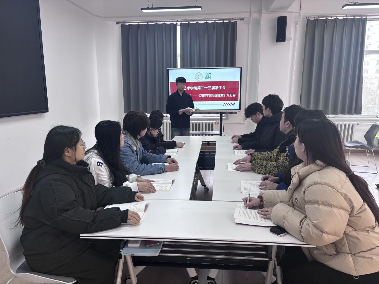 在研讨交流环节,同学们结合自身专业特长与实践经历,分享了各自的学习感悟。有同学谈到,书中阐释的“以人民为中心”发展思想,不仅为我们的艺术创作指明了方向,更让自己清晰认识到所学专业的价值与发展前景。也有同学分享自己在暑期参与“三下乡”社会实践时的体会,艺术创作需走进田间地头、贴近群众需求,要持续在乡村振兴与文化传承的一线挖掘创作素材,让作品既饱含泥土芬芳,又传递民生温度。另有同学分享道,“通过本次学习,我意识到专业技能不仅是安身立命的本领,更是践行使命担当的重要工具,我们要将书中的世界观与方法论转化为创作灵感 —— 用画笔勾勒美丽乡村的新面貌,用音符谱写乡村振兴的新乐章,用设计方案激活乡土文化的生命力,在参与国家文化建设、助力基层发展的实践中,让青春绽放出实实在在的光彩”。