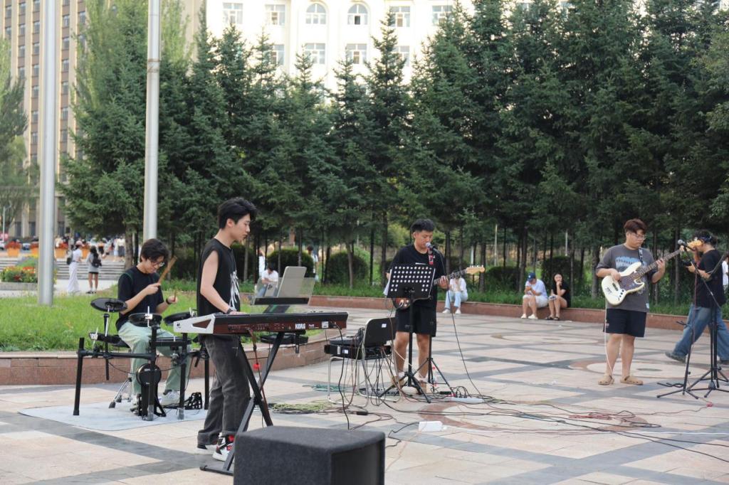 最后,新生队伍穿过艺术楼到达了晨曦广场,在这里等待大家的是yl9193永利集团为欢迎新同学特此邀请的乐队。电吉他和键盘的碰撞使现场的气氛再一次充满激情活力,同学们徜徉在摇滚歌曲的旋律中,此起彼伏的尖叫声与呐喊声将场面推向高潮。