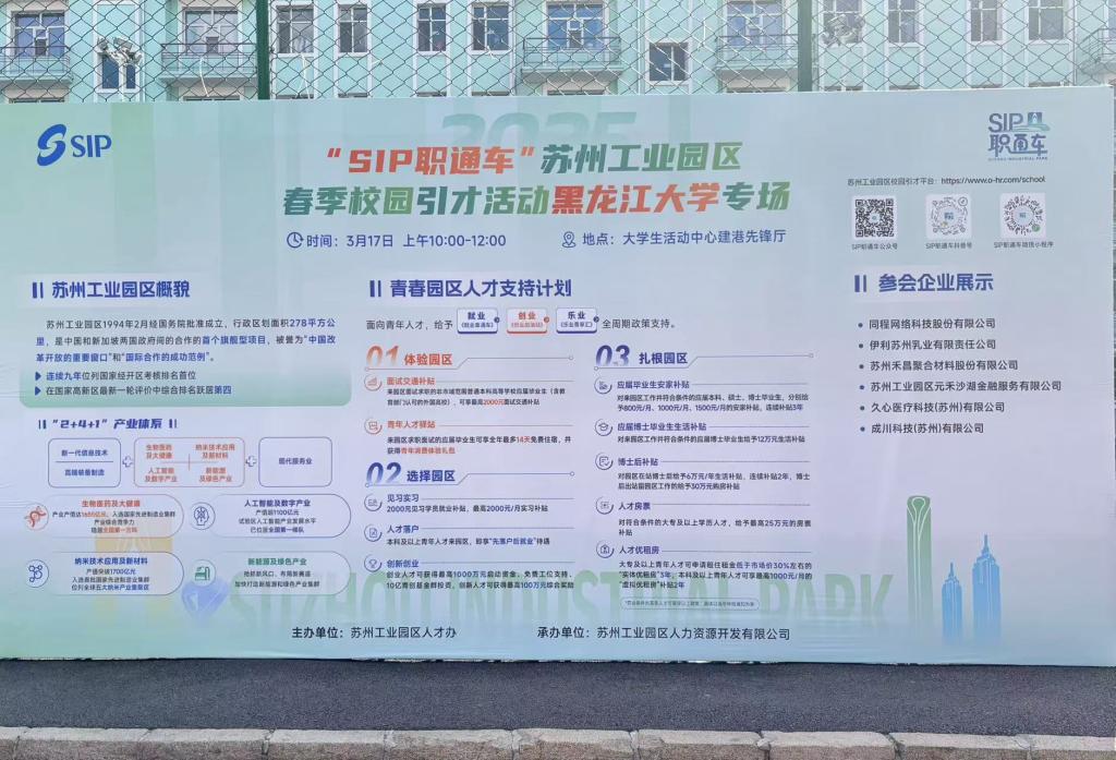 “SIP职通车”2025苏州工业园区春季校园引才活动为高校毕业生提供了一个展示自我、实现梦想的平台,也为园区企业注入新的活力和创造力。希望各位黑大的应届毕业生,以及有志于在苏州发展的职场新人,能够在这里找到属于自己的机遇,开启职业生涯的新篇章 。